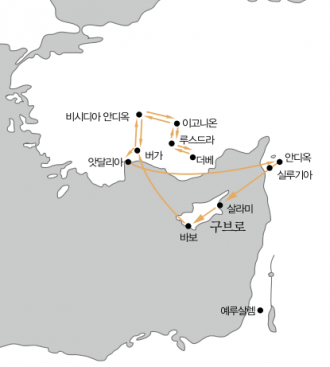 - 바보에서 버가를 거쳐 비시디아 안디옥에서 전도하다가, 쫓겨나 이고니온으로 갔다.
