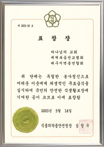File:하나님의 교회 대구지역총연합회-식품의약품안전청장 표창장.jpg