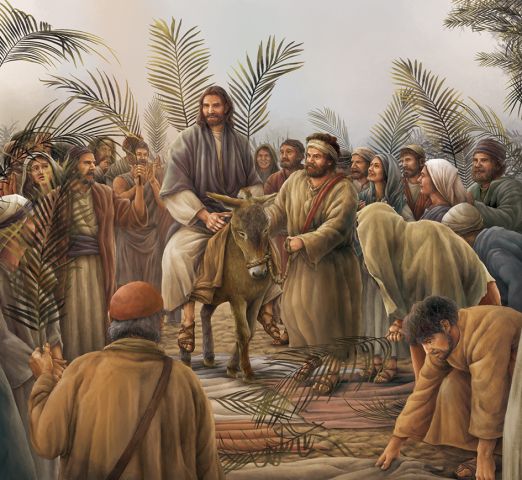 Jesus enters Jerusalem, riding on a colt, according to the prophecy of the Old Testament.